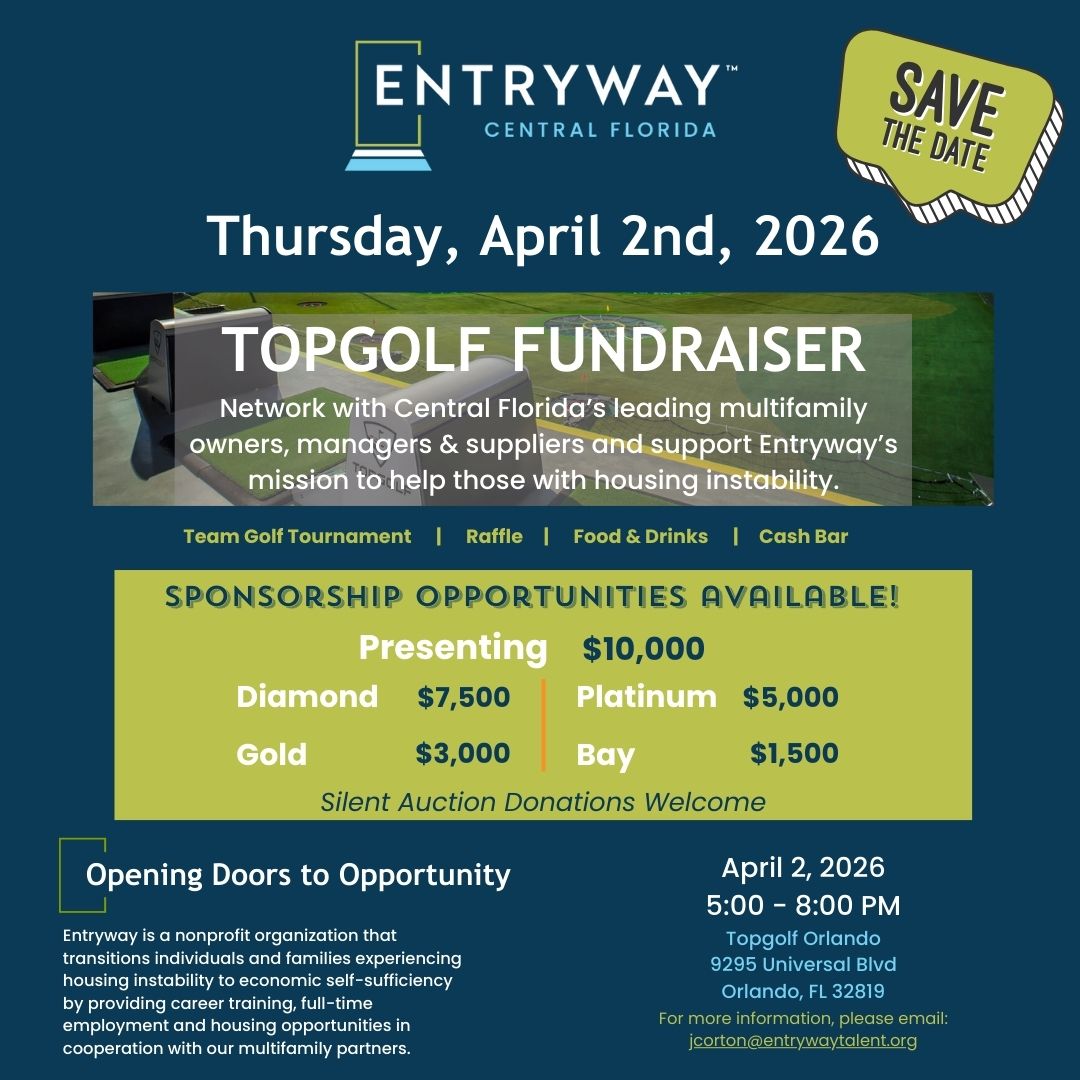 Network with Central Florida’s leading multifamily owners, managers, and suppliers, supporting Entryway’s mission to help those with housing instability.